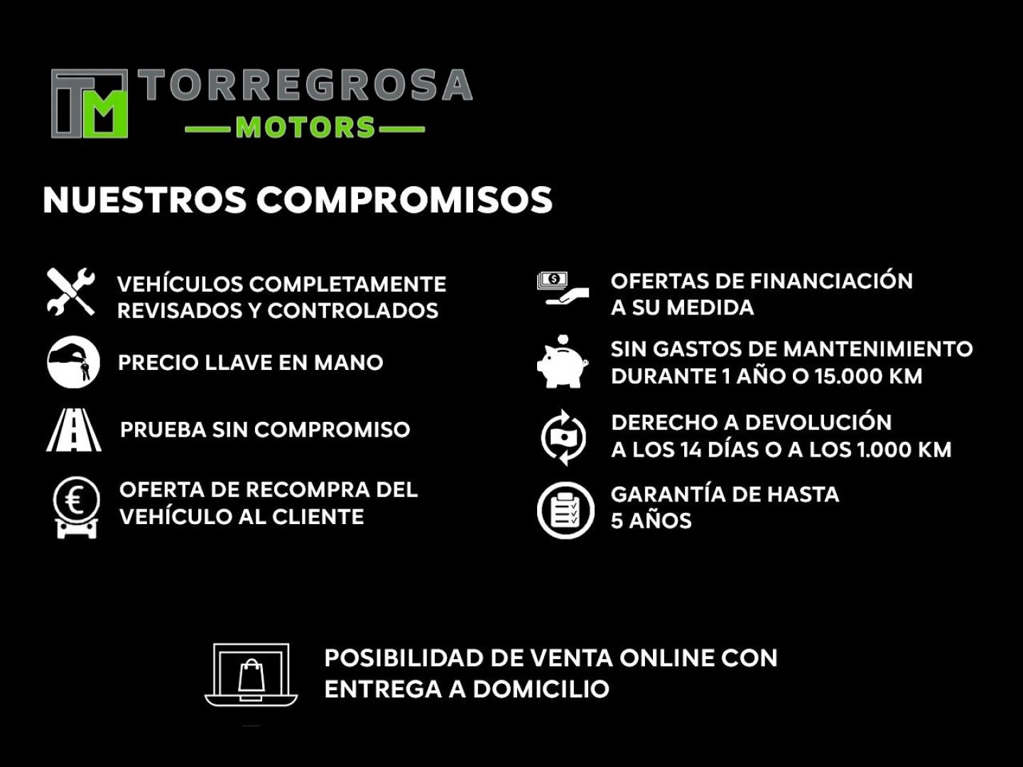 • Precio TODO INCLUIDO (salvo gastos de transferencia de 350€). • Revisión completa de 300 puntos de control. • 15 días de prueba o 1.000 km: si no estás satisfecho, ¡te lo cambiamos! • Financiación a medida hasta 96 meses. • Seguro personalizado: te damos la mejor cotización. • Aceptamos tu coche como parte de pago, con tasación inmediata. • Prueba del vehículo sin compromiso. • Certificado por escrito de kilometraje real y ausencia de daños estructurales. • ITV al día. • Envío de vídeos y fotos al momento.
